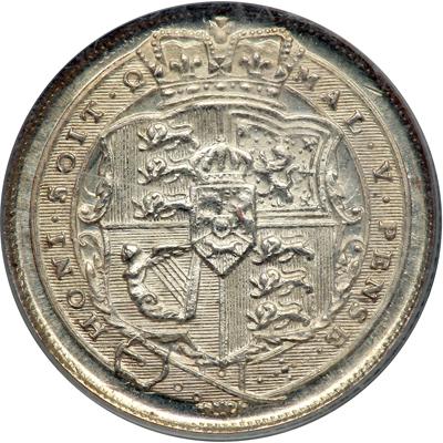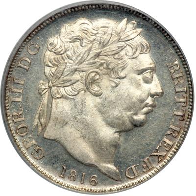 Great Britain. Sixpence, 1816. S.3791; KM-665. George III. Laureate head of King right. Reverse: Crowned shield in garter. A sharply struck coin with bright luster and crisp detail. PCGS graded MS-64.