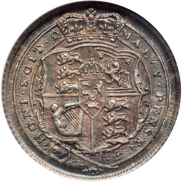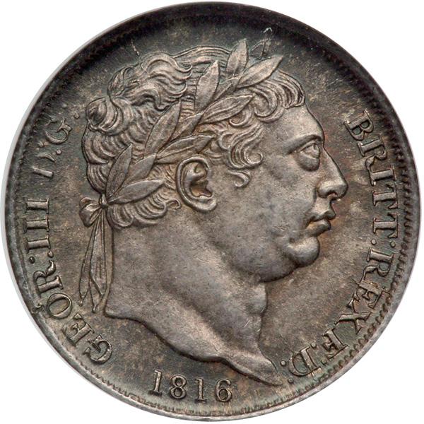 Great Britain. Sixpence, 1816. S.3791; ESC-1630; KM-665. George III. Laureate head right. Reverse: Crowned shield in garter. Deeply toned. NGC graded MS-64.