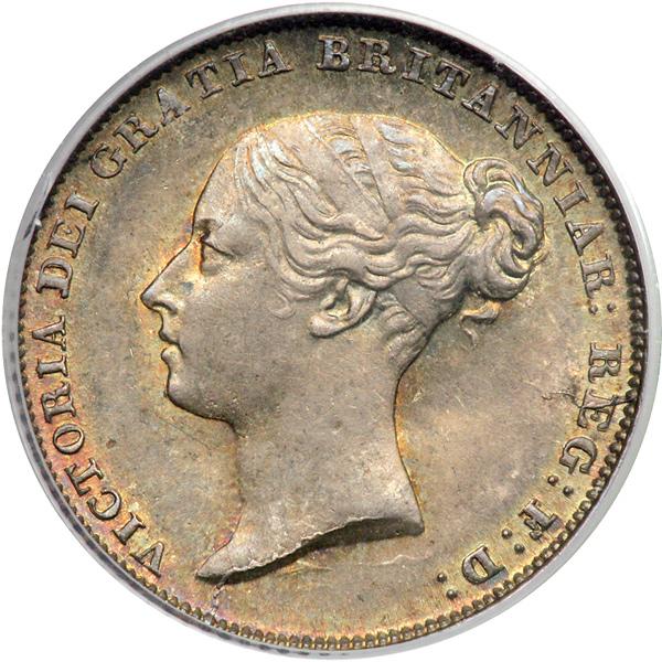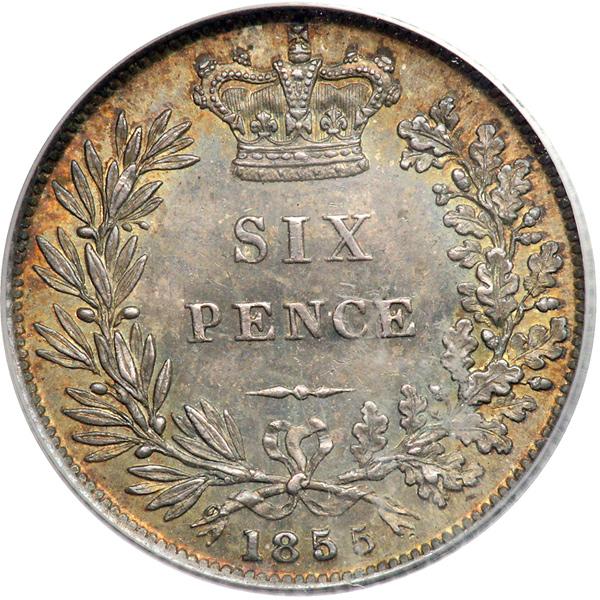 Great Britain. Sixpence, 1855. S.3908; ESC-1701; KM-733.1. Victoria. Young head. Lovely olive green and russet color toning. PCGS graded MS-63.