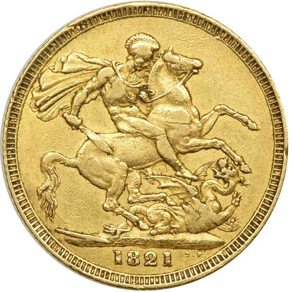 Great Britain. Sovereign, 1821. S. 3800; Fr-376; KM-682. George IV. Laureate head left. Reverse: St. George. Tiny edge nicks. Fine to Very Fine.