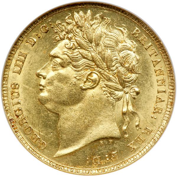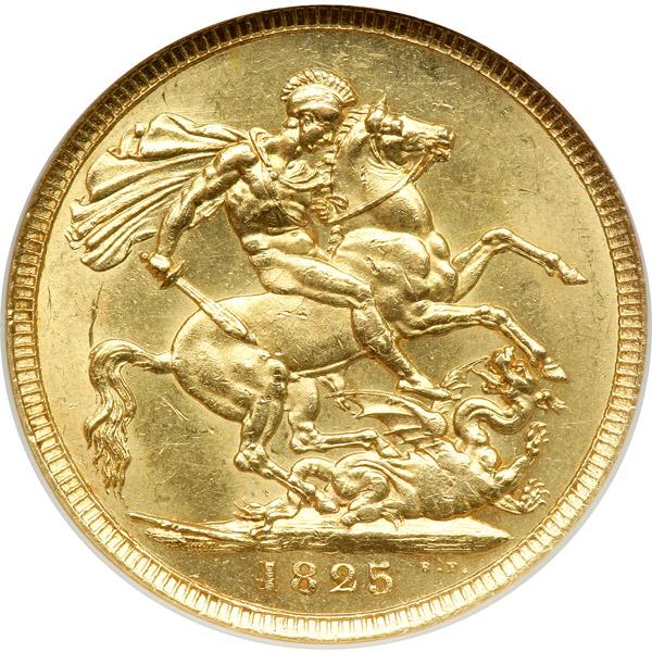 Great Britain. Sovereign, 1825. S.3800; Fr-376; KM-682. George IV, 1820-1830. Laureate head left. Reverse: St. George. Last year for this type, rare date and especially rare in top grade. NGC graded MS-62.
