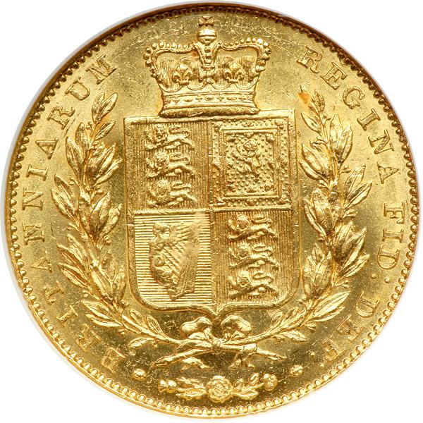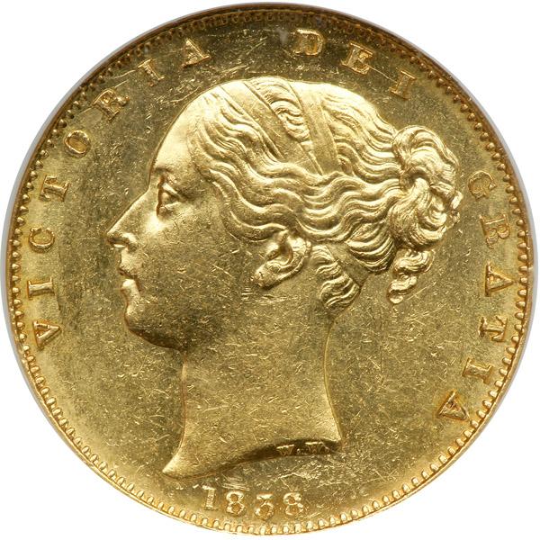 Great Britain. Sovereign, 1838. S.3852; Fr-387; KM-736.1. Victoria, 1837-1901. First (small) young head left. Reverse: Crowned shield. Very scarce first year and rare in top grades. NGC graded MS-61.