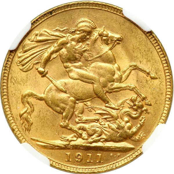 Great Britain. Sovereign, 1911. S.3996; Fr-404; KM-820. Weight 0.2355 ounce. George V. NGC graded MS-62.