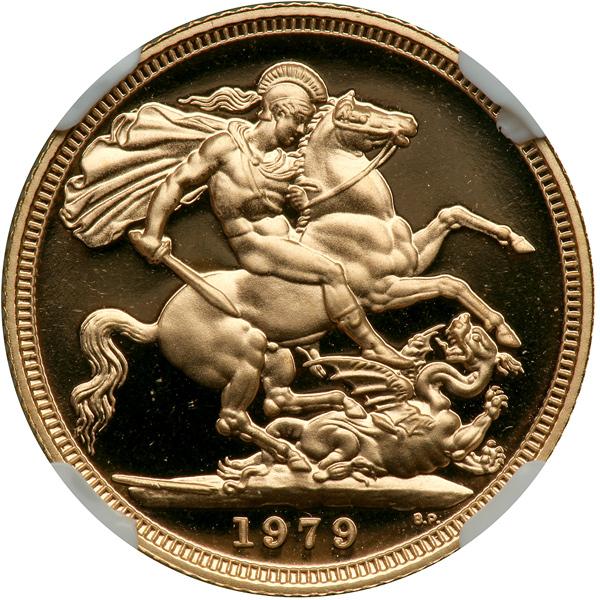 Great Britain. Sovereign, 1979. Fr-418; KM-919. Weight 0.2355 ounce. Elizabeth II. Reverse: St. George slaying the dragon. NGC graded Proof 68 Ultra Cameo.