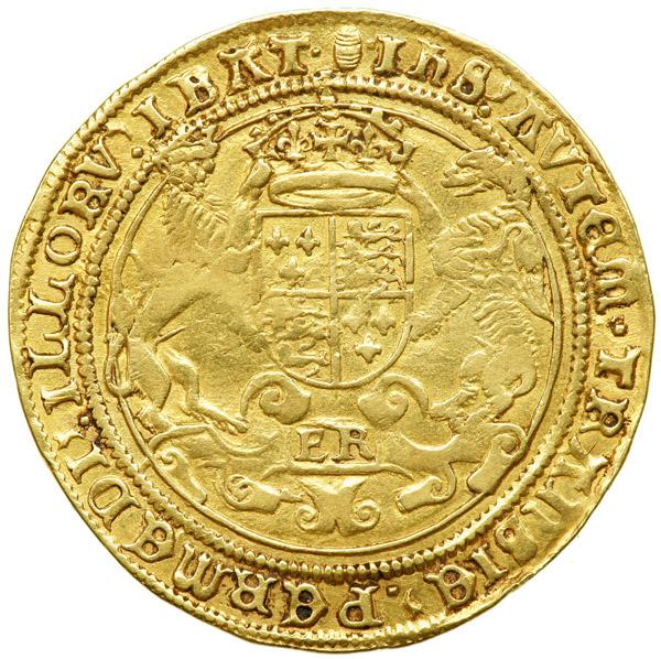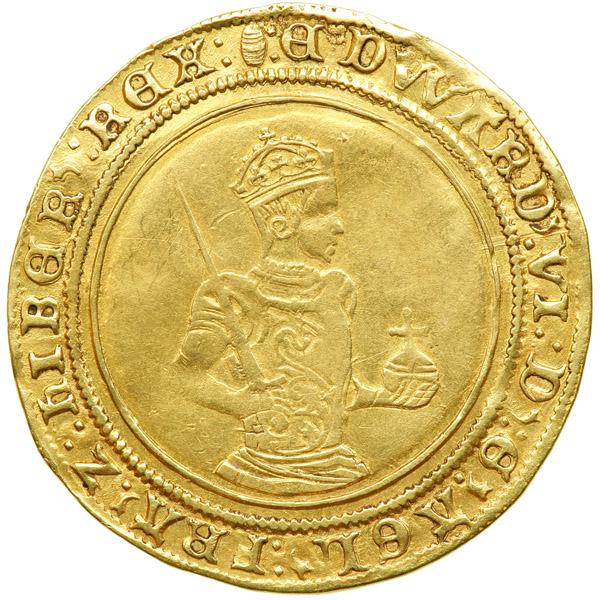 Great Britain. Sovereign, ND. S.2450; Fr-186. Edward VI, 1547-1553. Mint mark, Tun. Obverse: Half length figure of the King holding sword and orb. Reverse: Crowned shield with supporters and ER below. Pleasing portrait. PCGS graded EF-45.