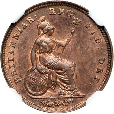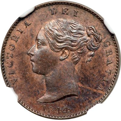 Great Britain. Third Farthing, 1844. S.3952; KM-743. Victoria, 1837-1901. Larger G in REG. Obverse: Wyon's young portrait of Queen left. Reverse: Britannia seated. The obverse has mirror fields under original luster and could be mistaken for a proof. The reverse has a satin look and practically full mint red with luster. Very very difficult to find in this high grade and probably under rated in the catalogues. In a new NGC 4 prong holder. NGC graded MS-64 Red & Brown.