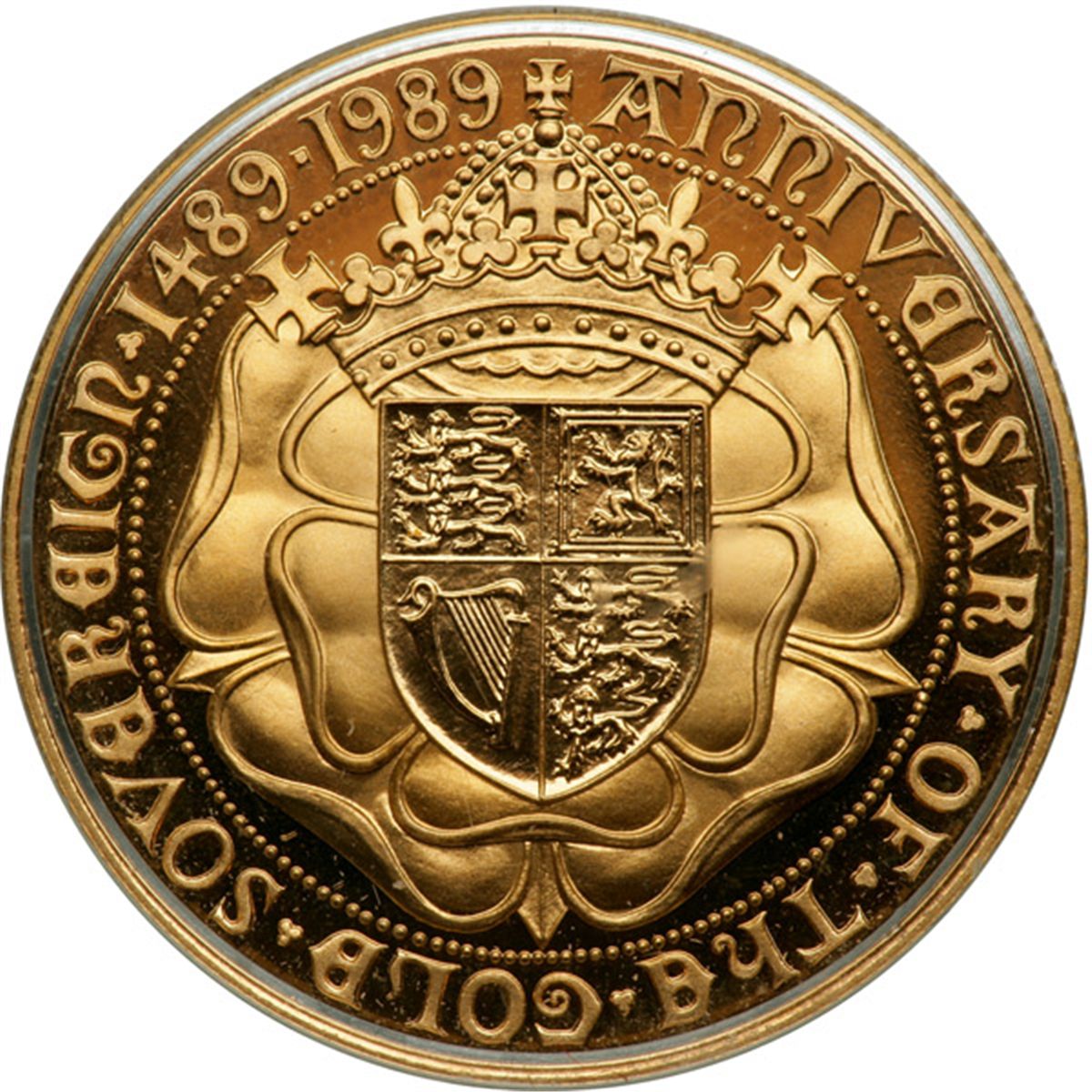 Great Britain. Three Piece Proof Set: 2 Pound, Sovereign and Half Sovereign, 1989. S.4262, 4272, 4277; KM-PS62 (KM-955-957). Elizabeth II. 500th Anniversary of the Gold Sovereign. In original case with certificate number 04028. Lot of 3 coins. Choice Brilliant Proof.