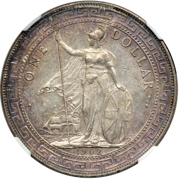 Great Britain. Trade Dollar, 1902-B. KM-T5. Britannia standing. NGC graded AU-58.