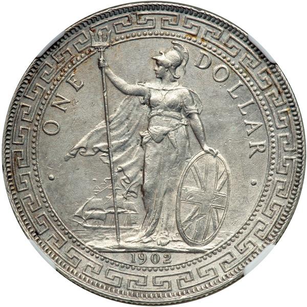 Great Britain. Trade Dollar, 1902-C. KM-T5. Britannia standing. NGC graded AU-58.