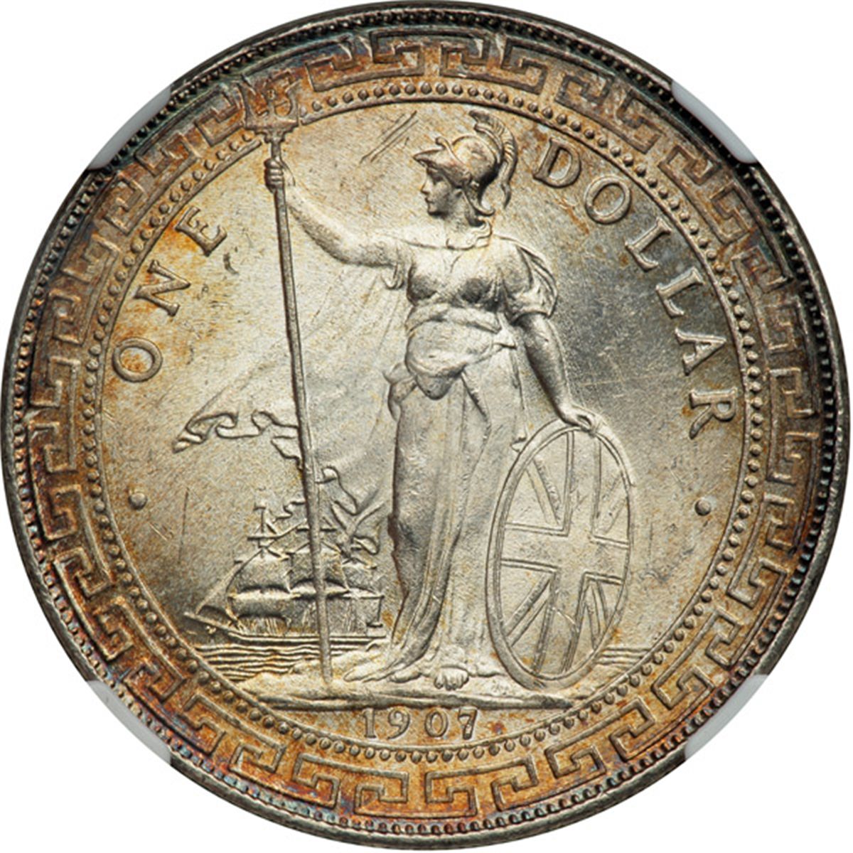 Great Britain. Trade Dollar, 1907-B. KM-T5. Britannia standing. Beautiful golden toning. NGC graded MS-63.