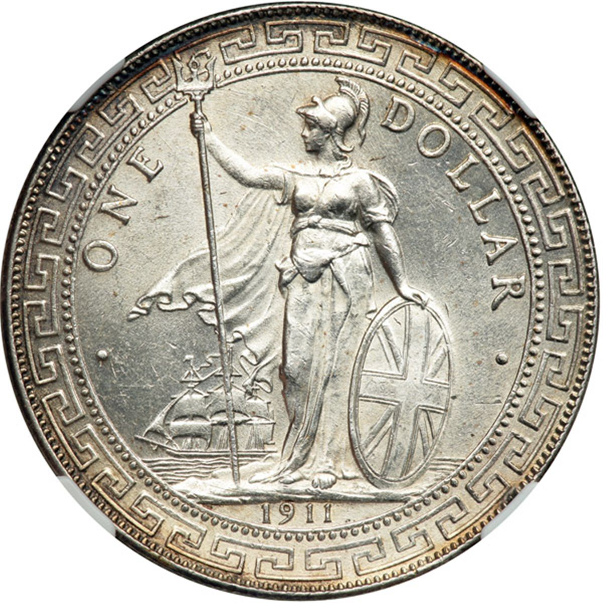 Great Britain. Trade Dollar, 1911-B. KM-T5. Britannia standing. Beautiful golden toning. NGC graded MS-62.