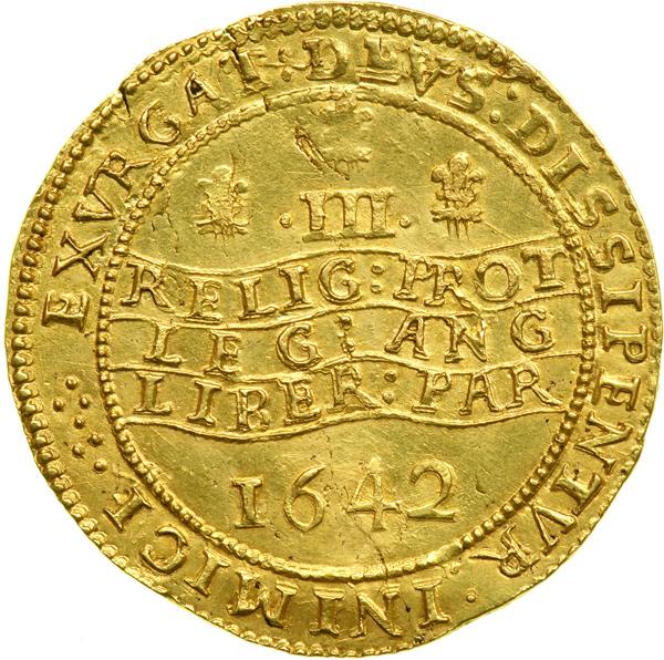 Great Britain. Triple Unite, 1642. B-J II/S4; Br-831; N-2381; S.2724; Fr-258. Charles I, 1625-1649. Oxford mint. Mint mark, plumelet obverse only. Obverse: Crowned half-length figure of king left touches rim but elbow does not break inner circle. Reverse: Declaration RELIG.PROT.LEG ANG. LIBER.PAR in three wavy lines, value and three plumes above, date below, group of seven pellets after INIMICI. Striking splits normal with this extremely rare die. NGC graded EF-45.