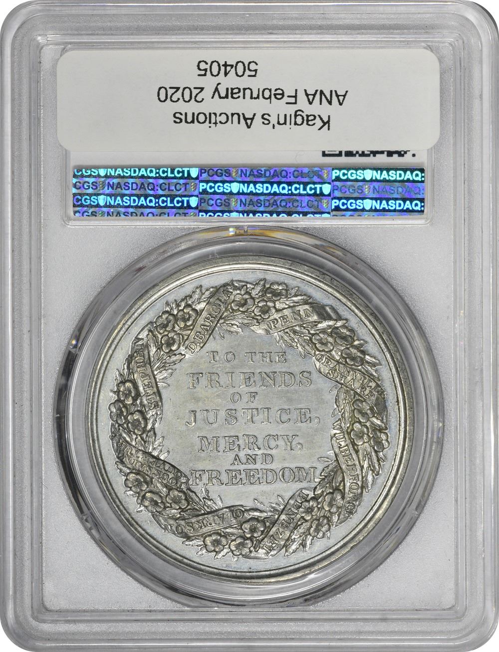 39 mm. Warm silver-gray surfaces exhibit bright luster on stain devices and mirror fields. This attractive medal represents the only Mint State example of the type at PCGS, and deserves special attention at bidding time just for that reason.