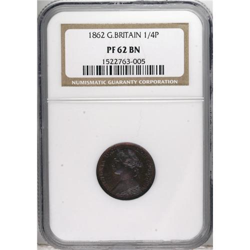 <B>Victoria Bun Head bronze Proof Farthing 1862,</B></I> S-3958, PR62 BN NGC, a pretty piece with handsome mauve color, a spot on reverse and another that some poor soul tried to remove, causing minor scratching in the field. Oh well, that's what makes 'em rare in super grades, in'tit?<BR><BR><b>Shipping:</b> Coins & Currency (<a target="_blank" href="http://www.heritageauctions.com/common/shipping.php">view shipping information</a>)