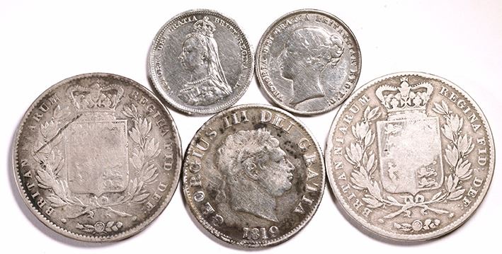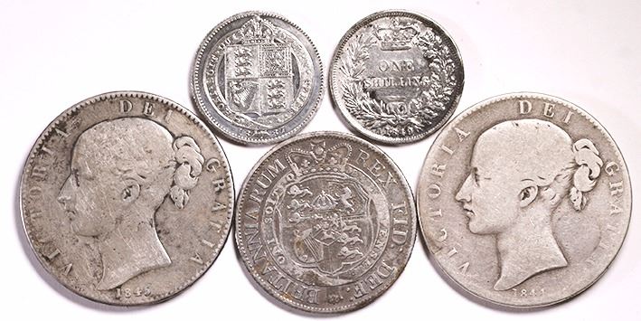 Great Britain, Victoria, silver Crown, 1944, 1945, both Cinquefoil stops, the second with scratch to reverse else grade as about good - good (S.3882); together with George II silver Half Crown, 1819 and Victoria silver Shilling, 1849, young head, 1887 veiled head, all heavily cleaned, graded good - very fine (S.3789, 3904, 3926)