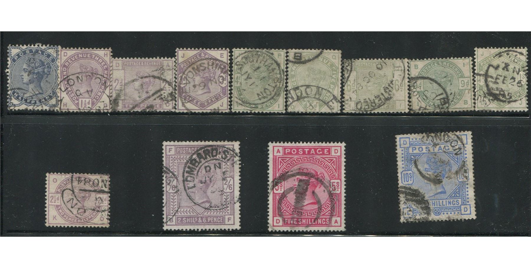 Great Britain Victoria early rare stamp collection. This collections includes 1883-1884: Complete set of 10 S/C #98 to #107 (S/C value = $1,681), 1883: 2 sh 6ph S/C #96 a44 (S/C value = $165), 5sh S/C #108 a51 (S/C value = $250), 10sh S/C #109 a52 (S/C value = $550).
