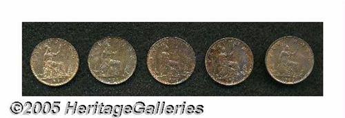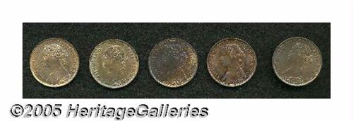 <B>Victoria Farthings as follows:</B></I> 1862, Unc; 1875-H, Unc; 1878, XF; 1891, Choice AU; and an 1893, mostly red Unc.