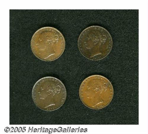 <B>Victoria Farthings including:</B></I> Isle of Man 1839, XF; 1853 W.W. raised, Choice AU-Unc; 1854, XF; and an 1857, Choice AU.