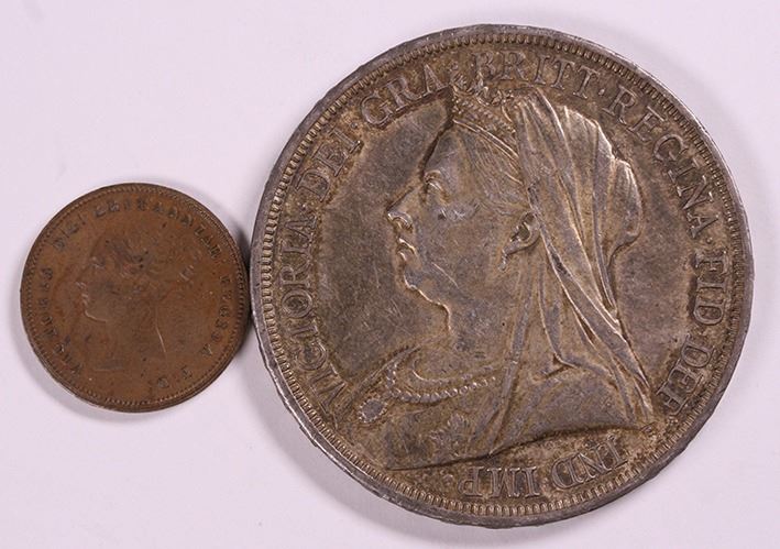 Great Britain, Victoria, veiled head, Crown, LVI; together with Victoria, Half Farthing, young head, 1843 (S.3937, 3951), the first with attractive natural toning and golden hues, graded as almost extremely fine, the last with die crack through crown, graded as almost very fine, reverse better (2 coins)