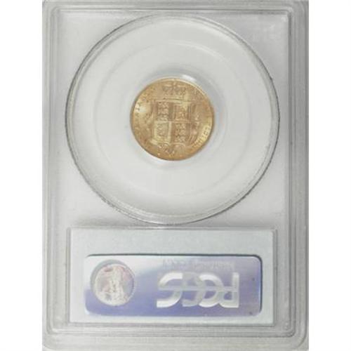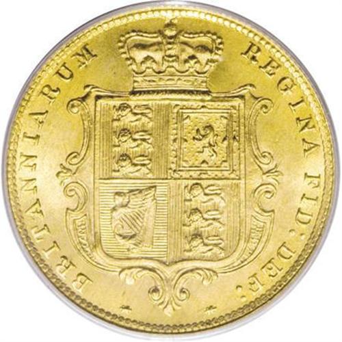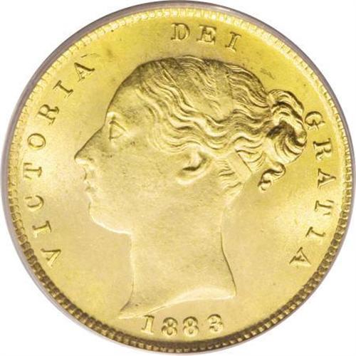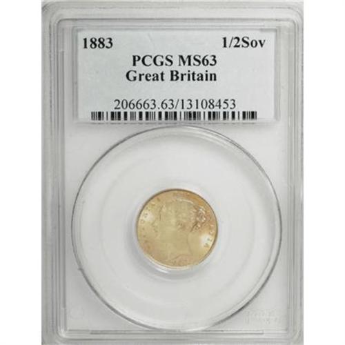 <B>Victoria Half Sovereign 1883,</B></I> S-3861, Young Head, Shield reverse, scarce date in exceptional condition, MS63 PCGS, Choice Uncirculated, full strike with all details of the reverse shield pin-sharp in quality, original satiny surfaces of beautiful gold color. <BR><BR><b>Shipping:</b> Coins & Currency (<a target="_blank" href="http://www.heritageauctions.com/common/shipping.php">view shipping information</a>)