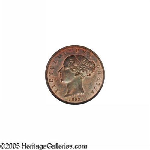 <B>Victoria Halfpenny 1853, </B></I>KM726, Proof 63 Brown NGC, superb details and considerable mint red.