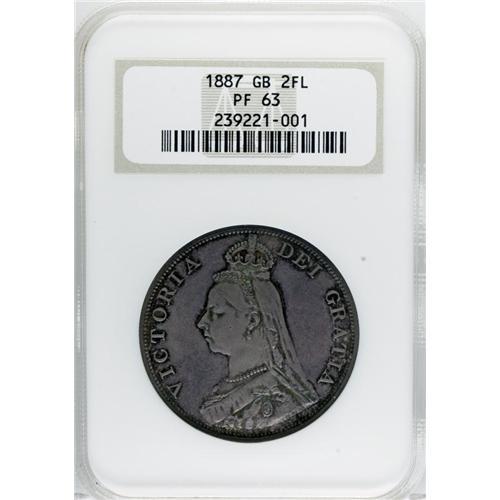 <B>Victoria Jubilee Head Proof Double-Florin 1887,</B></I> S-3923, PR63 NGC with blue, golden brown and gray toning.<BR><BR><b>Shipping:</b> Coins & Currency (<a target="_blank" href="http://www.heritageauctions.com/common/shipping.php">view shipping information</a>)