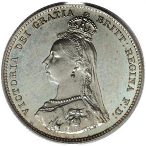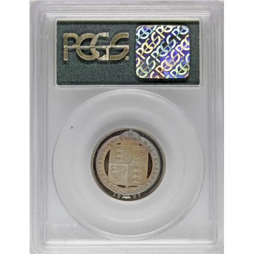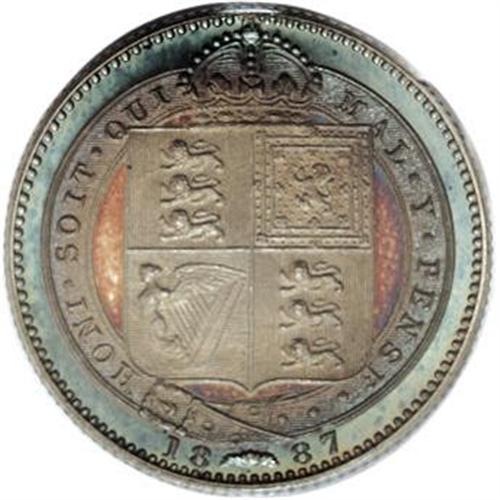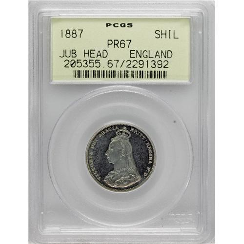 <B>Victoria Jubilee Head Proof Shilling 1887,</B></I> S-3926, PR67 PCGS, Gem Proof with delicate golden blue iridescence, mixed with some magenta on reverse. Seldom seen so nice. Spink 2007 catalogue value is only $90 "FDC" (about $180).<BR><BR><b>Shipping:</b> Coins & Currency (<a target="_blank" href="http://www.heritageauctions.com/common/shipping.php">view shipping information</a>)