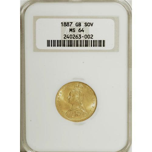 <B>Victoria Jubilee Head Sovereign 1887,</B></I> S-3866, MS64 NGC, fully struck and having beautiful, frosty gold surfaces. A second piece.<BR><I>From the Belle Glade Collection, Part Two.</B></I><BR><BR><b>Shipping:</b> Coins & Currency (<a target="_blank" href="http://www.heritageauctions.com/common/shipping.php">view shipping information</a>)