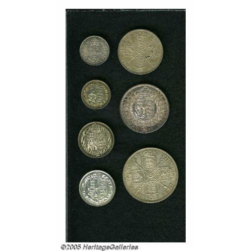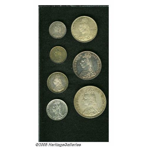 <B>Victoria Jubilee Partial type set as follows:</B></I> Sixpence 1887, KM759, Choice AU; Sixpence 1889, KM760, AU; Shilling 1887, KM761, XF/AU; Shilling 1890, KM774, harshly cleaned XF; Florin 1887, KM762, Choice AU; Halfcrown 1887, KM764, lightly cleaned AU; and a Double Florin 1887 Arabic 1, KM763, AU.