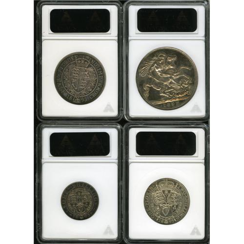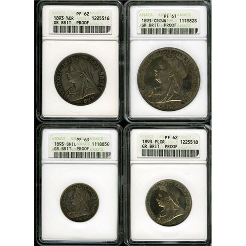 <B>Victoria Old Head silver Proofs 1893:</B></I> Shilling PR63, lovely golden blue iridescent toning, light hairlines; Florin PR62, silvery and mottled gold toning; Halfcrown PR62, mottled but pretty golden blue iridescent toning; Crown PR61, brilliant with light golden blue toning. All are in ANACS slabs.<BR><BR><b>Shipping:</b> Coins & Currency (<a target="_blank" href="http://www.heritageauctions.com/common/shipping.php">view shipping information</a>)