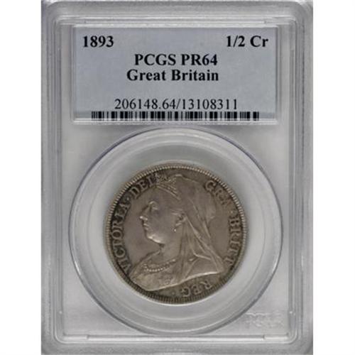<B>Victoria Proof Halfcrown 1893,</B></I> S-3938, Old Head, PR64 PCGS, Superb Choice Proof (if not Gem) with virtually no hairlines, not even the finest, as well as completely original, deeply mirrored surfaces showing delicate golden blue iridescent toning. Most pieces of the small mintage of this style struck for the Proof sets of 1893, the first year showing the Old or Veiled Bust of the queen, have been abused over the past century, with few survivors of this quality level to be found. Same comment pertains to the shilling in the previous lot.<BR><BR><b>Shipping:</b> Coins & Currency (<a target="_blank" href="http://www.heritageauctions.com/common/shipping.php">view shipping information</a>)