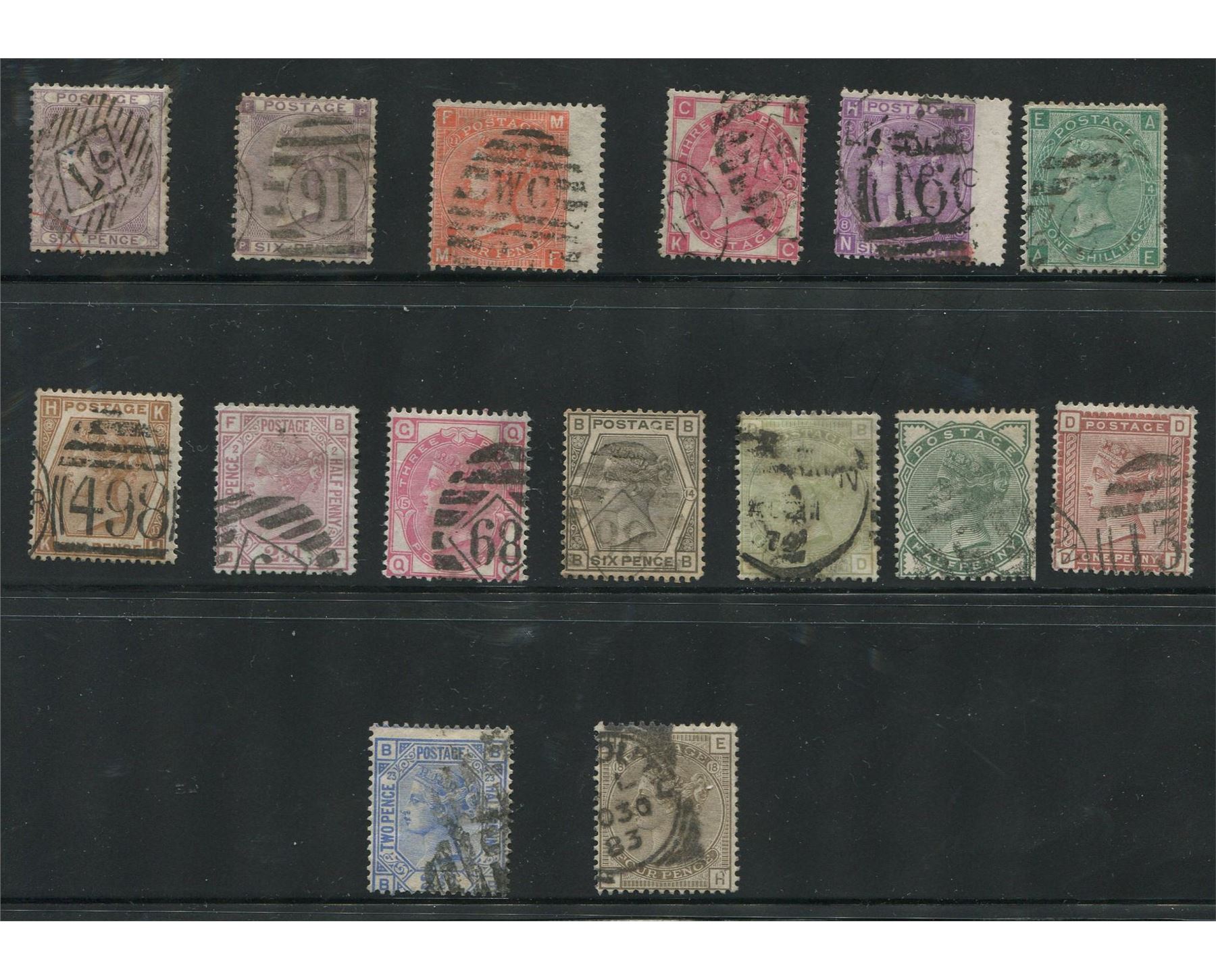 Great Britain Victoria stamp collection. This collection contains 15 stamps. Included are 1- 6p lilac #27 a6 (S/C value = $100), 1- 6p lilac #45 a18 (S/C value = $100), 1- 4p vermillion #43 a16 (S/C value = $62.50), 1- 3p rose #49 a17 (S/C value = $92.50), 1- 6p red violet #51 a22 (S/C value = $90), 1- 1sh green #48 a21 (S/C value = $225), 1- 6p brown #59 a26 (S/C value = $55), 1- 2 1/2p claret #66 a30 (S/C value = $90), 1- 3p rose #44 a17 (S/C value = $215), 1- 6p gray #62 a28 (S/C value = $70), 1- 4p #63 a8 (S/C value = $120), 1- 1/2p #125 a54 (S/C value = $2.25), 1p #79 a36 (S/C value = $72.50), 1- 2 1/2p blue #68 a30 (S/C value = $35), 1- 4p gray brown #71 a31 (S/C value = $500). Total S/C value = $1,800.
