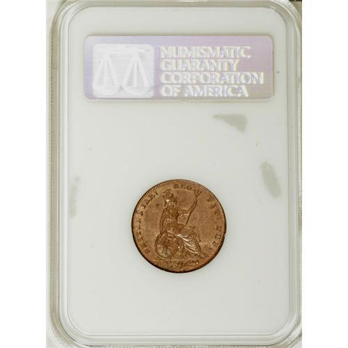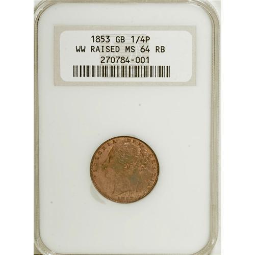 <B>Victoria Young Head Farthing 1853,</B></I> S-3950, MS64 RB NGC, mostly brick-red and quite nice indeed.<BR><BR><b>Shipping:</b> Coins & Currency (<a target="_blank" href="http://www.heritageauctions.com/common/shipping.php">view shipping information</a>)