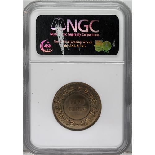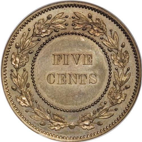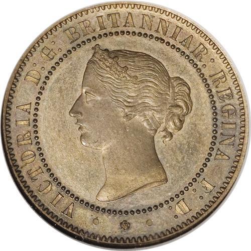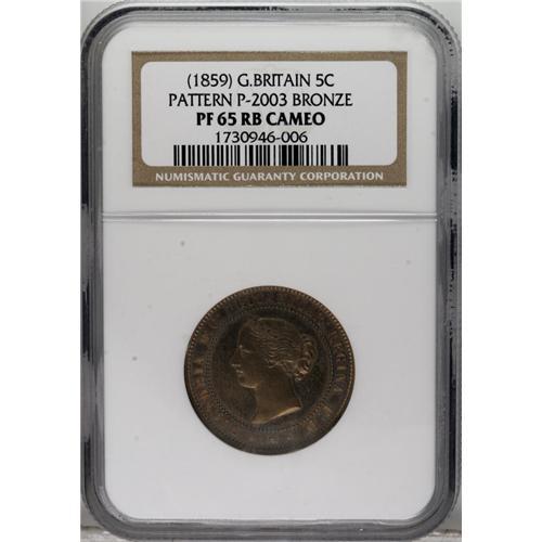 <B>Victoria bronze pattern Decimal 5 Cents (1859),</B></I> P-2003 (as extremely rare), PR65 RB Cameo NGC, an exquisite example of this rarity, meant as a pattern for the new, then-proposed bronze halfpenny coinage. Almost full golden red luster, just a delight to view and study!<BR><BR><b>Shipping:</b> Coins & Currency (<a target="_blank" href="http://www.heritageauctions.com/common/shipping.php">view shipping information</a>)