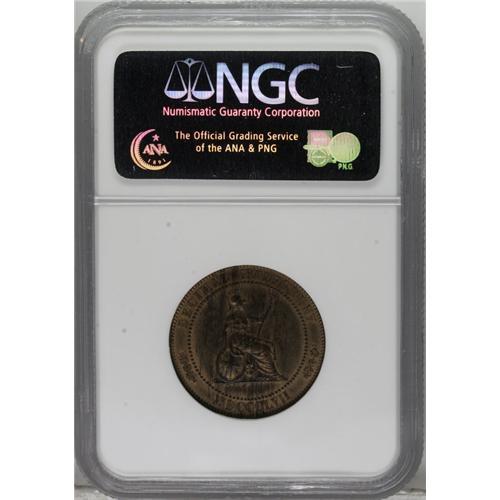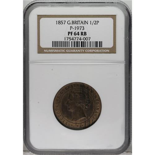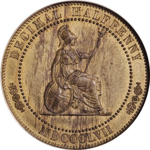 <B>Victoria bronze pattern Decimal Halfpenny 1857,</B></I> P-1973 (as very rare), PR64 RB NGC, a beautiful specimen that seems conservatively graded as a mere 64, for its surfaces are essentially pristine, untouched, showing golden red mixed nicely with light brown toning. A really desirable piece!<BR><BR><b>Shipping:</b> Coins & Currency (<a target="_blank" href="http://www.heritageauctions.com/common/shipping.php">view shipping information</a>)