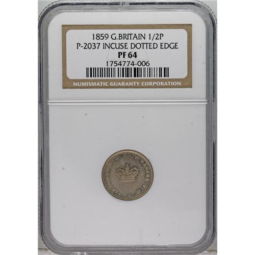 <B>Victoria copper-nickel pattern 1/2 Penny 1859,</B></I> P-2037, incuse dotted edge (notes the slab insert: edge is not visible), PR64 NGC, a lovely example of this piece which is rated "extremely rare" by Peck. The metal is fairly bright with only the tiniest flecks.<BR><BR><b>Shipping:</b> Coins & Currency (<a target="_blank" href="http://www.heritageauctions.com/common/shipping.php">view shipping information</a>)