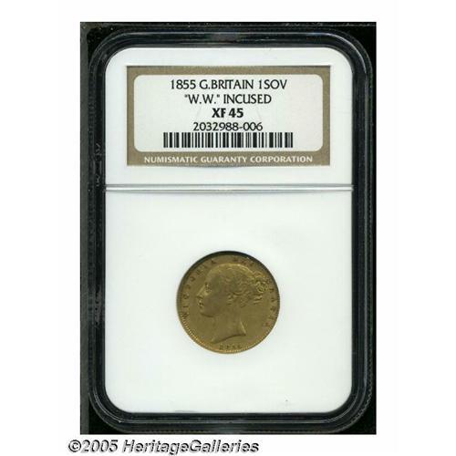 <B>Victoria gold Sovereign 1855 WW Incuse, </B></I>KM736.1, XF45 NGC.