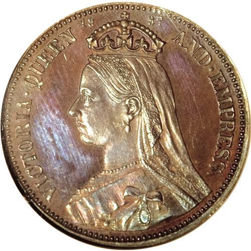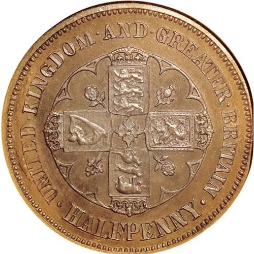 <B>Victoria pattern Halfpenny by Weyl 1887,</B></I> P-2192, Freeman-929 (as R19 in his rarity scale, 2-5 known), bronzed, Plain Edge (not visible in the slab), PR65 BN "Cheshire Collection" NGC, a sensational item created by the German engraver Adolph Weyl, celebrating the British Empire at Queen Victoria's jubilee by using English instead of the traditional Latin for the legends, and including "foreign" animals (elephant, seal and kangaroo) in one of the decorative sides of the reverse shield, along with traditional emblems. Peck believed this pattern, and its relatives, to have been intended for colonial coinages (hence those animals), but as they were never issued he included them in his classic reference on British coins. This is a sensational specimen, a Gem Proof with purplish brown surfaces highlighted by a vivid blue and magenta iridescence, an elegant coin by anyone's standards. Additional comments (also by BL, who catalogued that sale) may be read in the Goldbergs' auction catalogue of the Cheshire Collection (May 30-June 1, 2005, Lot 3136), which was the previous appearance of this wonderful coin. Worth strong bids!<BR><BR><b>Shipping:</b> Coins & Currency (<a target="_blank" href="http://www.heritageauctions.com/common/shipping.php">view shipping information</a>)