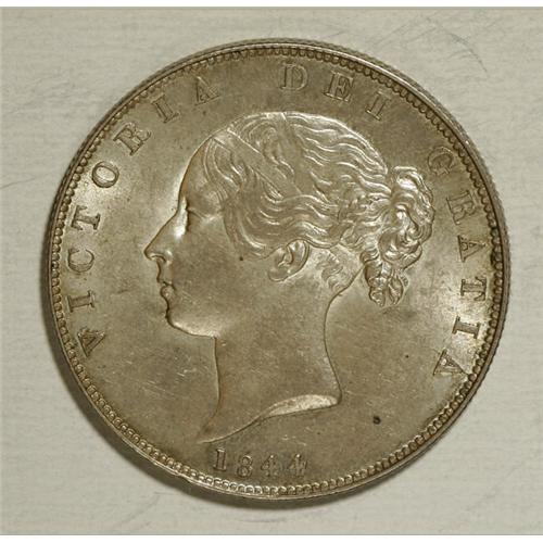 <B>Victoria silver pair:</B></I> (1) Halfcrown 1844, Young Head, S-3888, AU-Unc., a choice-looking coin with the slightest wear but exceptionally clean fields showing hardly a mark. Silvery white luster, and very sharply struck, showing almost all tiny design details. Very scarce. Normal reeded edge; together with (2) Double-Florin 1887, Jubilee Head, S-3922, Roman I in date, a pleasing brilliant Unc. piece, common type but usually found in lesser grade, whereas this piece is almost fully struck and has frosty white silvery luster, just scattered small abrasions.<BR><BR><b>Shipping:</b> Coins & Currency (<a target="_blank" href="http://www.heritageauctions.com/common/shipping.php">view shipping information</a>)