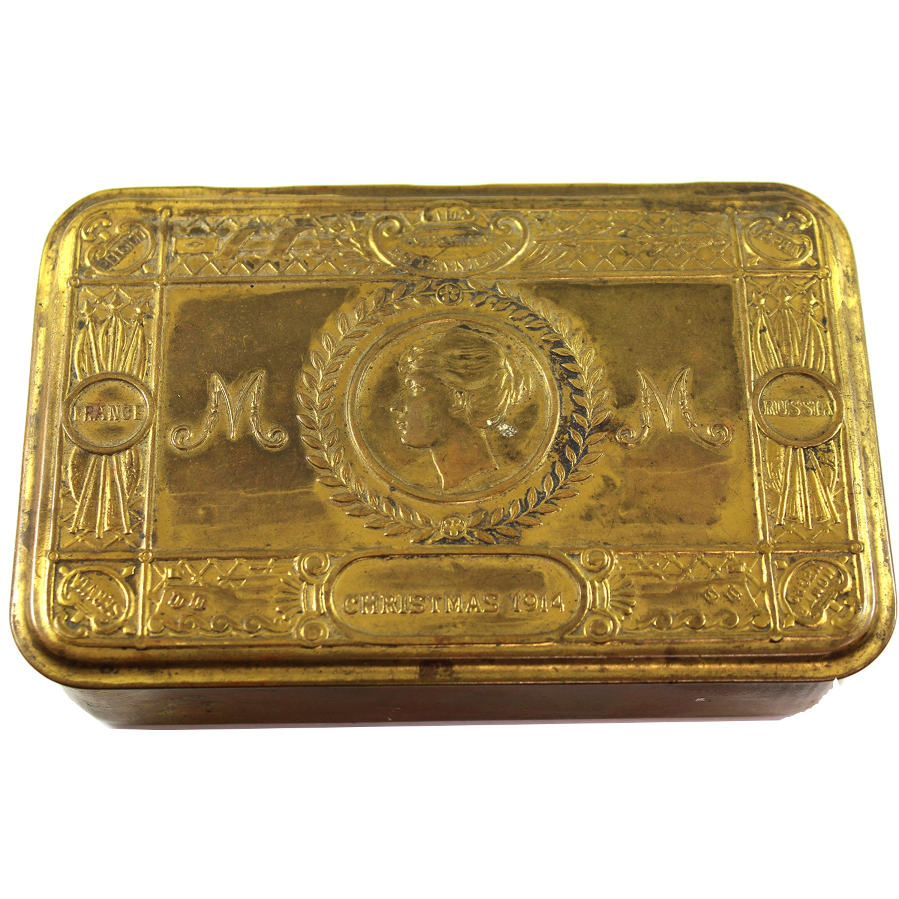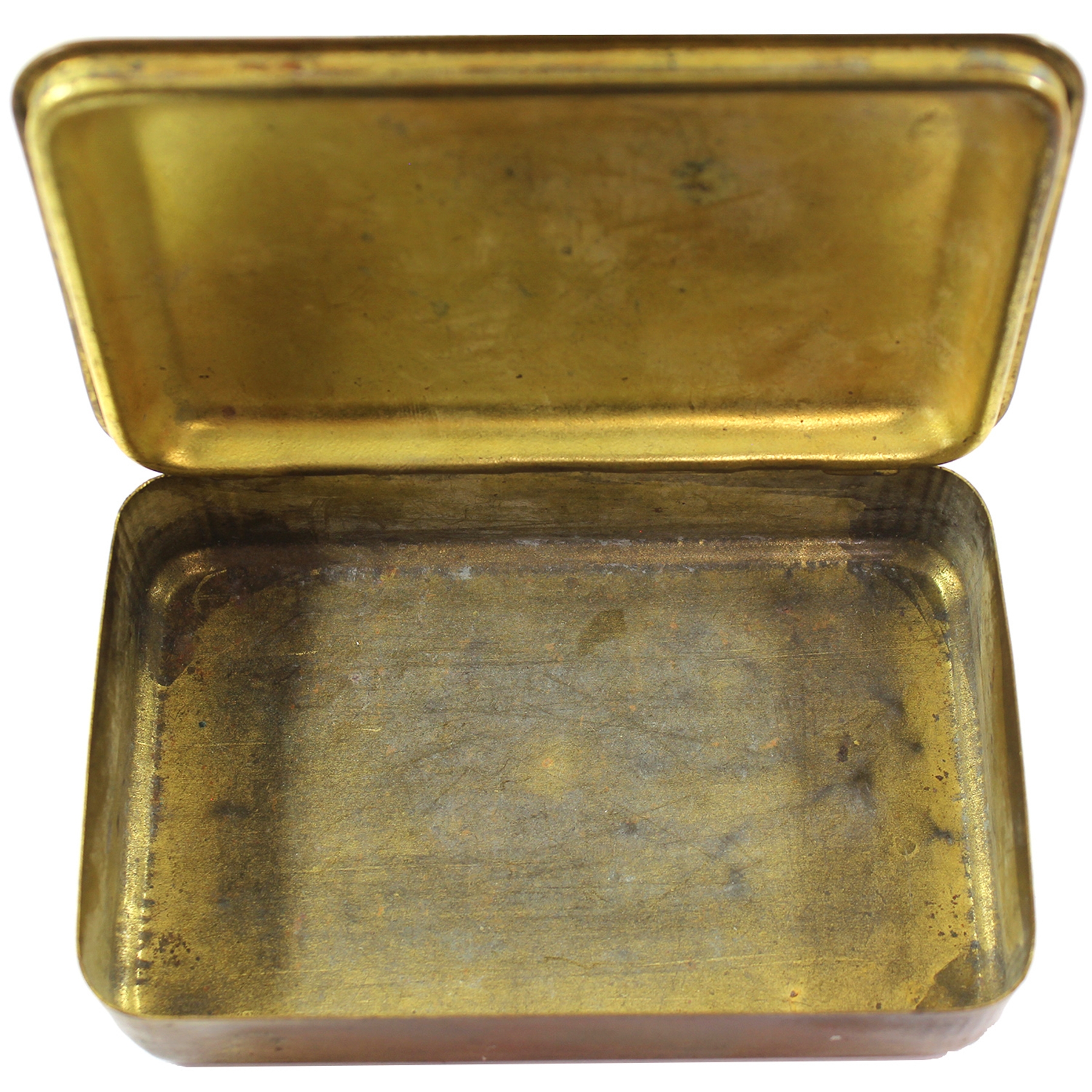Contents of the tins varied based on recipient. They included items such as, tobacco, cigarettes, Christmas cards, a bullet pencil, candy, photograph of Princess Mary etc. The boxes were originally intended for "every sailor afloat and every soldier at the front" on Christmas day 1914 but eligibility was soon extended to everyone "wearing the King's uniform on Christmas day"