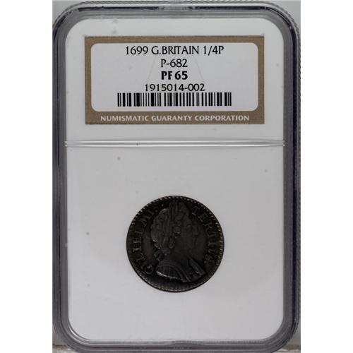 <B>William III silver pattern Farthing 1699,</B></I> type of S-3558, P-682, no stop after date, PR65 NGC, a handsomely toned piece showing bluish gold iridescence but a few faint scratches and some rubbing from being in cabinets no doubt. Nonetheless a desirable piece. Very scarce.<BR><BR><b>Shipping:</b> Coins & Currency (<a target="_blank" href="http://www.heritageauctions.com/common/shipping.php">view shipping information</a>)