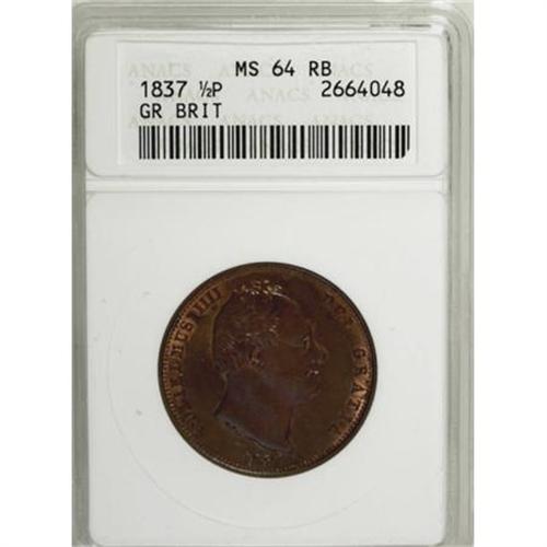 <B>William IV copper Halfpenny 1837,</B></I> S-3847, MS64 RB ANACS, an elusive condition, very choice with ample mint luster along the rims and the legends, crisp strike on both side, diebreak to right of date and another above the king's forehead.<BR><BR><b>Shipping:</b> Coins & Currency (<a target="_blank" href="http://www.heritageauctions.com/common/shipping.php">view shipping information</a>)