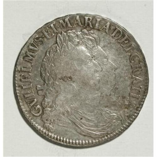 <B>William & Mary Crown 1691,</B></I> S-3433, TERTIO edge, "I" over faint "E" in king's name, "G" notably recut, Very Fine, pleasant enough with old, light silvery gray surfaces showing iridescent hues. Scarce.<BR><BR><b>Shipping:</b> Coins & Currency (<a target="_blank" href="http://www.heritageauctions.com/common/shipping.php">view shipping information</a>)
