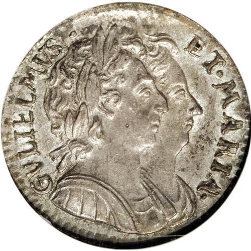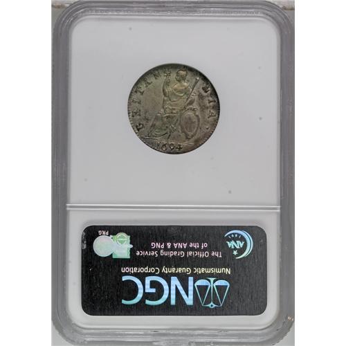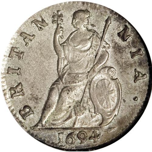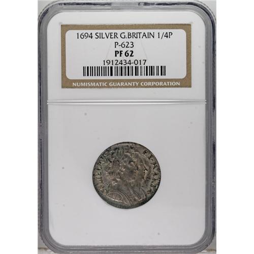 <B>William & Mary pattern Farthing in silver 1694,</B></I> P-623, PR62 NGC, handsome ancient, pewter-like toning, light scuffs in right obverse field but still quite choice. Edge, weight and exact diameter not discernible in the slab, but NGC designated it as this Peck variety (the question of whether it is a Proof or not depends on seeing the edge). These are varyingly called patterns, off-metal strikes, or Proofs; they precede the copper issue of 1694. Nice W&M farthings such as this piece are not easy to locate. Appears to be ex Baldwin's Auction 44, Gregory Collection (May 2, 2006), Lot 641 (as P-623, weight 4.55g), which sold for $980 (approx. $1,800).<BR><BR><b>Shipping:</b> Coins & Currency (<a target="_blank" href="http://www.heritageauctions.com/common/shipping.php">view shipping information</a>)