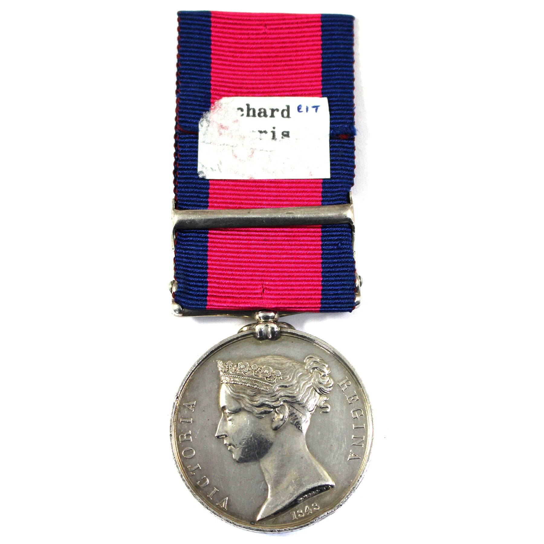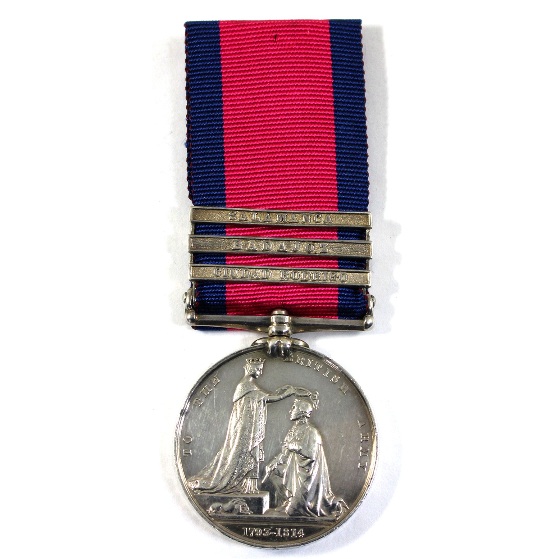 Great Britain c.1848 Military General Service Medal; CLASPS: Salamanca (22nd July, 1812), Badajoz (17th March – 6th April, 1812), & Ciudad Rodrigo (8th -19th January, 1812); NAMED: Richard P. Harris 7th Regiment of Foot ; 36mm. As a retrospective award for various military actions between 1793 and 1814, encompassing the French Revolutionary Wars, the Napoleonic Wars, and the Anglo-American War of 1812, the Military General Service Medal (MGSM) was awarded to surviving claimants of the British Army in 1848. Accompanied by copies of Private Richard Harris' military records. Medal is bright and well maintained with minimal wear or markings. Sticker along back of ribbon
