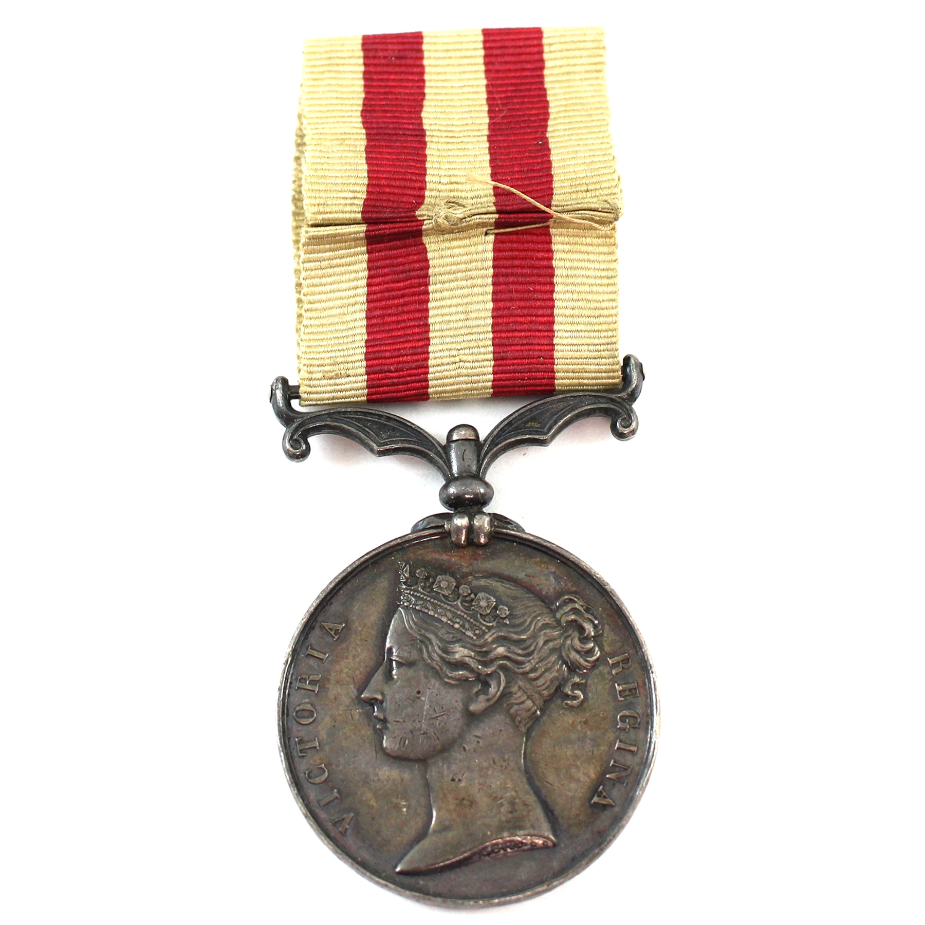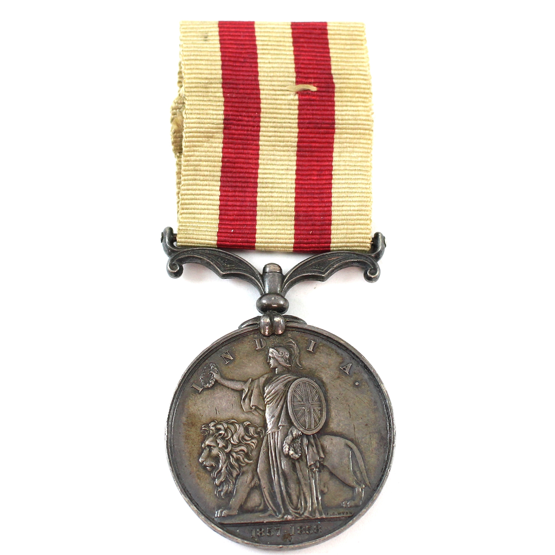 Awarded by to officers and men serving in British and Indian units during the Indian Mutiny. Initially, the medal was issued without a clasp, as seen in this example, to those who served in operations against the mutineers. Subsequently, due to the 1868 extension of eligibility, clasps were awarded to individuals who later became entitled to the medal. Name of issue has been scraped off, likely by a recipient who would no longer possess the medal due to various reasons such as loss, theft, or sale during difficult times.