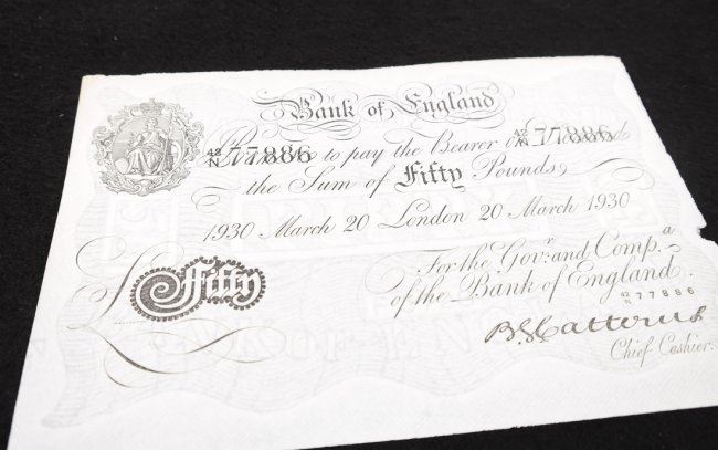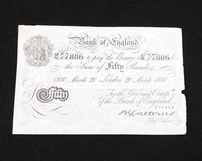 Bank of England March 20, 1930 £50 white note. Small notch at right as issued, extremely fine.