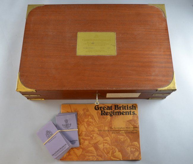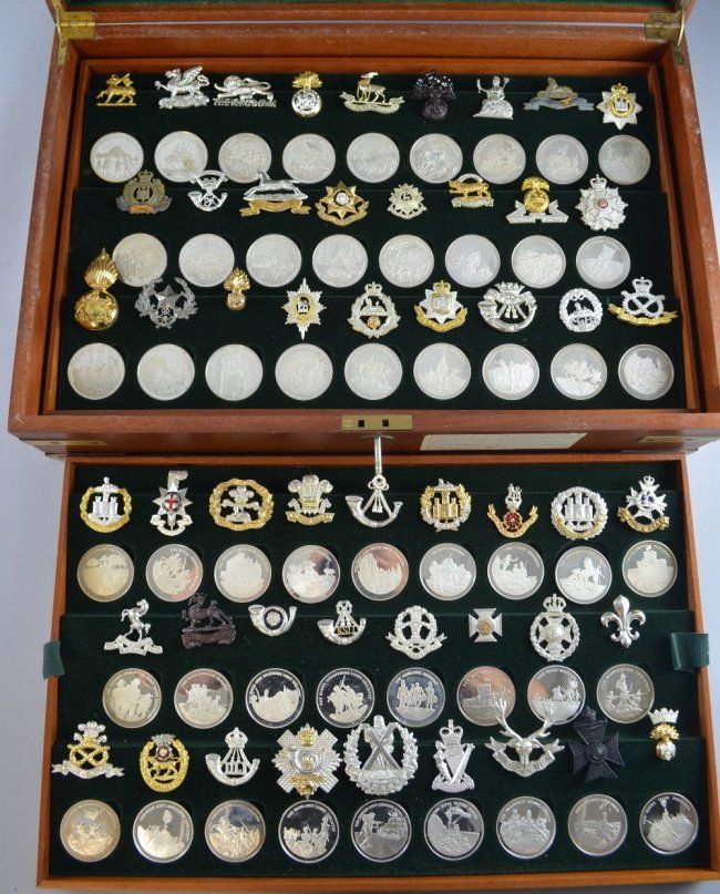 Great British Regiments, a cased set of 52 silver Medals with Insignia, limited edition, the brass lid plaque inscribed ?The Birmingham Mint?s tribute to the 52 time honoured regiments of the line that have passed into legend?, (each medal weighs 1.45 oz)