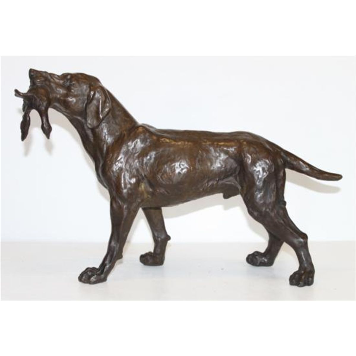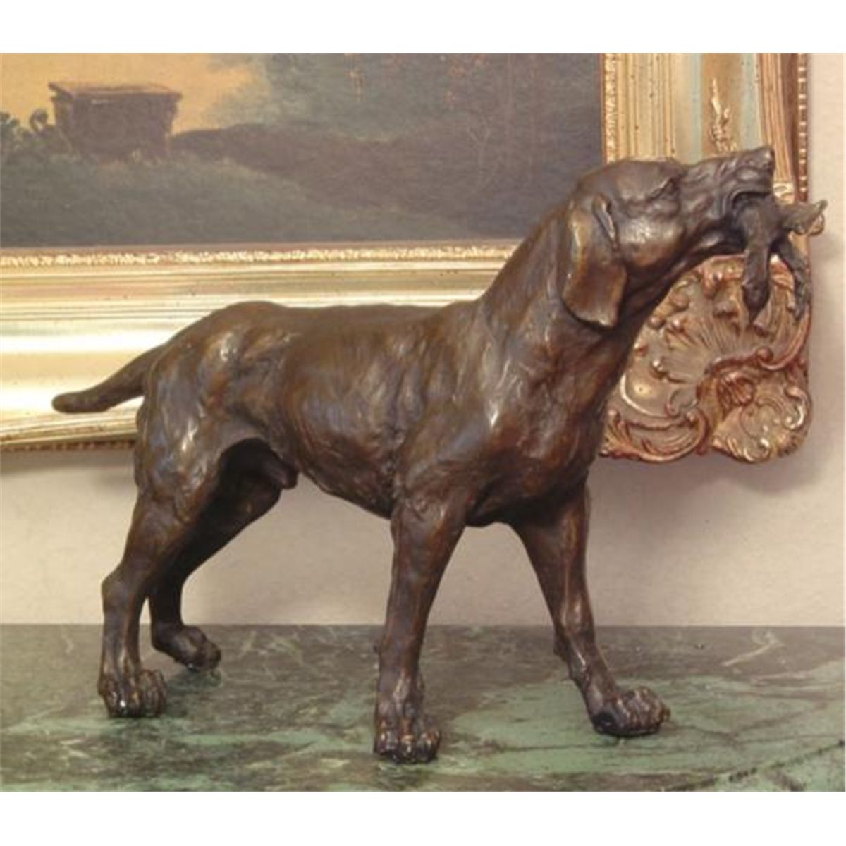Retriever - Hunting Dog, Bronze Sculpture, After Barye, 12"H x18"W x 6"D18 lbs This bronze sculpture was produced using the "Lost Wax" casting method. The"Lost Wax" Cast method is the most precise metal casting technique in existence, ensuring exquisite detail of the original host model which is usually sculpted in clay or wax. This "Lost Wax" casting method is an extremely labor intensive and expensive process, but the end results produce a Heirloom Quality Masterpiece!Antoine-louis Barye (1796 - 1875) Originally trained as a goldsmith, Antoine-Louis Barye served in Napoleon's army before studying sculpture and painting. He entered the Ecole des Beaux-Arts in 1818 and adapted the romantic-style subject matter of violent and majestic animals. After his crocodile-like sculpture entitled Tiger Devouring a Gavail, won a medal at the Salon of 1831, Barye became a successful and independent sculptor and painter. His animal sculptures competed at the Salon alongside the more traditional and revered human figures. In 1845, Barye began a foundry that produced smaller and more affordable bronze statues. He was appointed the keeper of plaster casts at the Louvre and professor of zoological drawing at the Musee National d'Histoire Naturelle, both in Paris. Elected to the Academie in 1868, Barye inspired a later generation of animal sculptors who called themselves the animaliers.A retriever is a type of gun dog that retrieves game for a hunter. Generally gun-dogs are divided into three major classifications: retrievers,flushing spaniels, and pointing breeds. Retrievers were bred primarily to retrieve birds or other prey and return them to the hunter without damage. Although spaniels and some pointing breeds routinely retrieve game, and many retrievers are skilled in finding game, retrievers are distinguished in that non-slip retrieval is their primary function. As a result, retriever breeds are bred for soft mouths and a great willingness to please, learn, and obey. A soft mouth refers to the willingness of the dog to carry game in its mouth without biting into it. "Hard mouth" is a serious fault in a hunting dog and is one that is very difficult to correct. Newfoundlands are very nice retrievers although the name doesn't say they are soft mouthed-willing to retrieve dogs. Many retriever dogs are willing to please and are very loyal and good tempered like the labrador retriever, golden retriever and newfoundland.