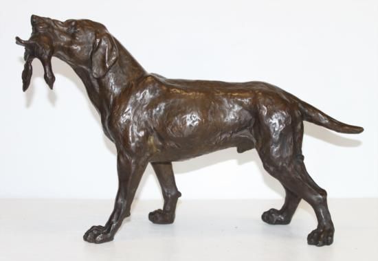 Retriever - Hunting Dog, Bronze Sculpture, After Barye, 12"H x18"W x 6"D18 lbs This bronze sculpture was produced using the "Lost Wax" casting method. The"Lost Wax" Cast method is the most precise metal casting technique in existence, ensuring exquisite detail of the original host model which is usually sculpted in clay or wax. This "Lost Wax" casting method is an extremely labor intensive and expensive process, but the end results produce a Heirloom Quality Masterpiece!Antoine-louis Barye (1796 - 1875) Originally trained as a goldsmith, Antoine-Louis Barye served in Napoleon's army before studying sculpture and painting. He entered the Ecole des Beaux-Arts in 1818 and adapted the romantic-style subject matter of violent and majestic animals. After his crocodile-like sculpture entitled Tiger Devouring a Gavail, won a medal at the Salon of 1831, Barye became a successful and independent sculptor and painter. His animal sculptures competed at the Salon alongside the more traditional and revered human figures. In 1845, Barye began a foundry that produced smaller and more affordable bronze statues. He was appointed the keeper of plaster casts at the Louvre and professor of zoological drawing at the Musee National d'Histoire Naturelle, both in Paris. Elected to the Academie in 1868, Barye inspired a later generation of animal sculptors who called themselves the animaliers.A retriever is a type of gun dog that retrieves game for a hunter. Generally gun-dogs are divided into three major classifications: retrievers,flushing spaniels, and pointing breeds. Retrievers were bred primarily to retrieve birds or other prey and return them to the hunter without damage. Although spaniels and some pointing breeds routinely retrieve game, and many retrievers are skilled in finding game, retrievers are distinguished in that non-slip retrieval is their primary function. As a result, retriever breeds are bred for soft mouths and a great willingness to please, learn, and obey. A soft mouth refers to the willingness of the dog to carry game in its mouth without biting into it. "Hard mouth" is a serious fault in a hunting dog and is one that is very difficult to correct. Newfoundlands are very nice retrievers although the name doesn't say they are soft mouthed-willing to retrieve dogs. Many retriever dogs are willing to please and are very loyal and good tempered like the labrador retriever, golden retriever and newfoundland.